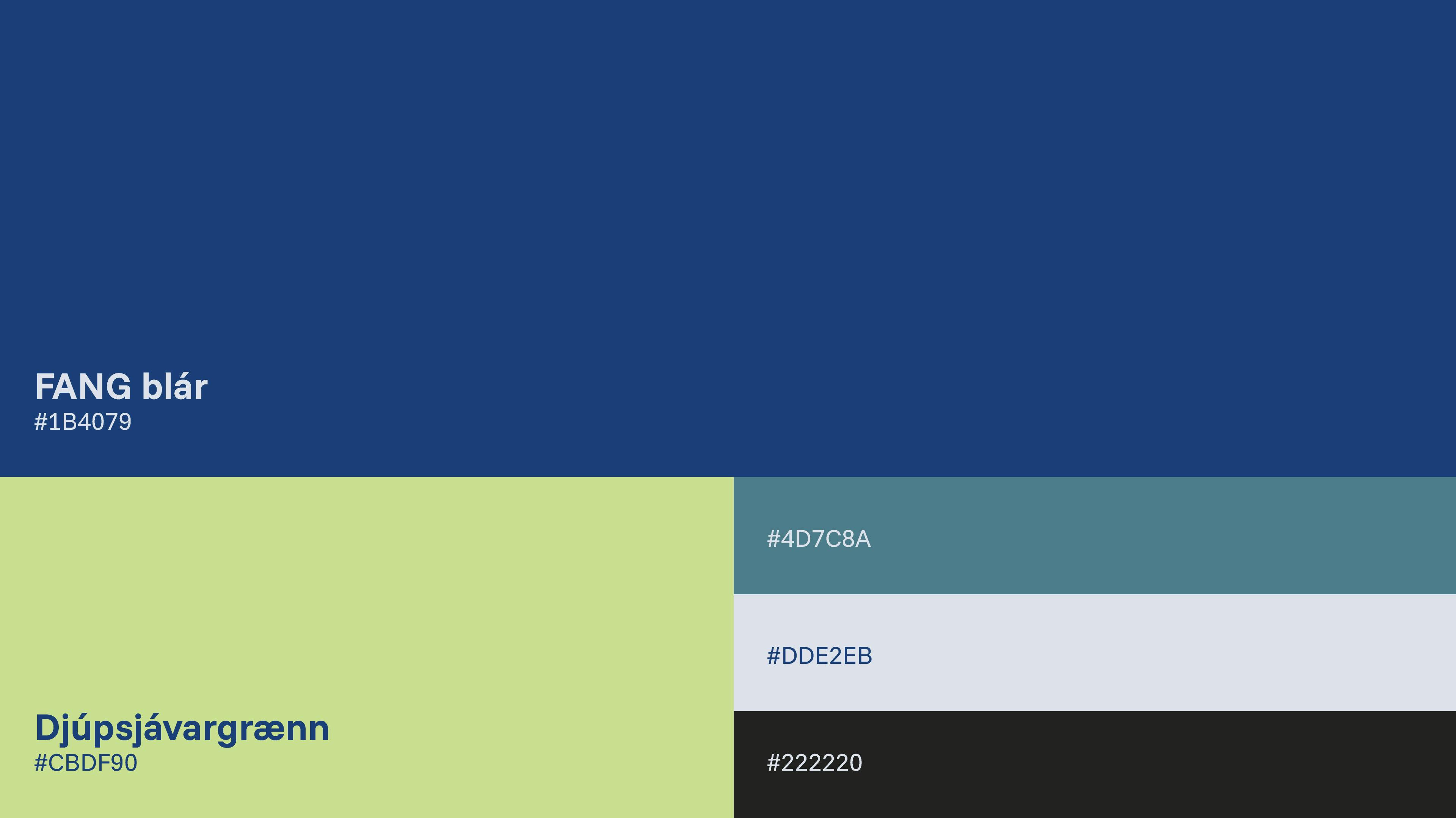 Aðallitur Fang er fallegur dökkblár, sem vekur hughrif um traust og hafið. Græni liturinn nýtist vel sem orkuríkur aukalitur í mismunandi mynstur eða grafíska viðbót, t.d. hreyfigrafík, bakgrunnsmyndir og viðbót við kynningarefni.
